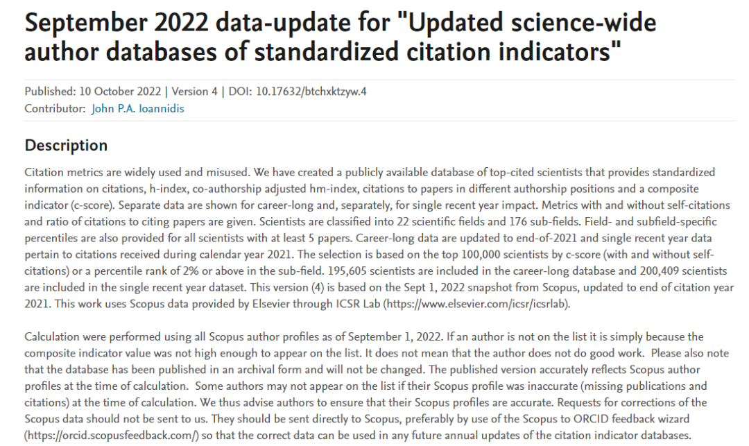 10月10日,由斯坦福大学John P.A.Ioannidis教授团队发布的全球前2%顶尖科学家榜单更新了2022年版本,这也是该团队公布的第四版本。本次发布的为2022年版本,发布时间为2022年10月10日,统计数据时间节点为1960-2022年,涵盖全球200,409 位科学家。榜单主要分为“终身科学影响力排行榜(1960-2022)”和“2022年度科学影响力排行榜”两个榜单。