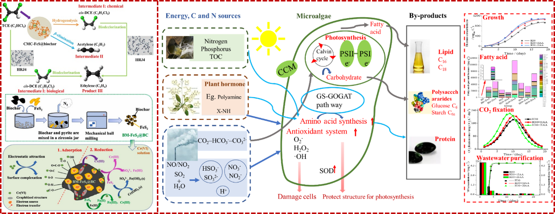 开发新型生物炭基、铁基功能材料等通过吸附、高级氧化、还原等耦合机制应用于水体和土壤环境污染修复的效果和机理,建立功能材料“设计研发——环境修复应用——环境生态效应”的全链条体系。