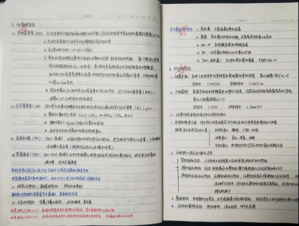 记笔记的习惯因人而异。我喜欢收集各种好看的笔记本,也很享受把课本上和老师所补充的内容条理清晰记在笔记本上的成就感。做笔记的时候黑、红、蓝三色足够我来使用。这次我选择的环评笔记和水污染课程笔记,就是我这学期最满意的两份笔记。