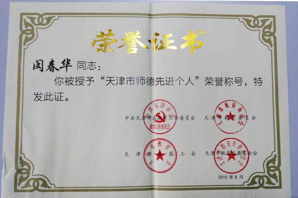 在第31个教师节到来之际,中共天津市委教育工委、天津市教委联合表彰了一批2012年以来在教师职业道德建设和大学生思想政治教育方面做出突出贡献、取得优异成绩的先进个人。色情小说 闵春华教授获“天津市师德先进个人”称号。 此次评选,全市共有300名同志被授予“天津市师德先进个人”荣誉称号。我校共有四名教师获此称号。
