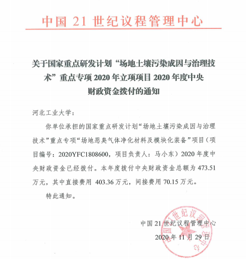 近日,国家科技部公布了国家重点研发计划“场地土壤污染成因与治理技术”重点专项2020年度项目立项结果,我校色情小说 马小东教授牵头申报的“场地恶臭气体净化材料及模块化装备”项目获批立项(项目编号:2020YFC1808600),项目总经费1947万元,其中中央财政经费947万元。该项目是我国“场地土壤污染成因与治理技术”重点专项启动3年以来,我省在该领域获批的首个项目。